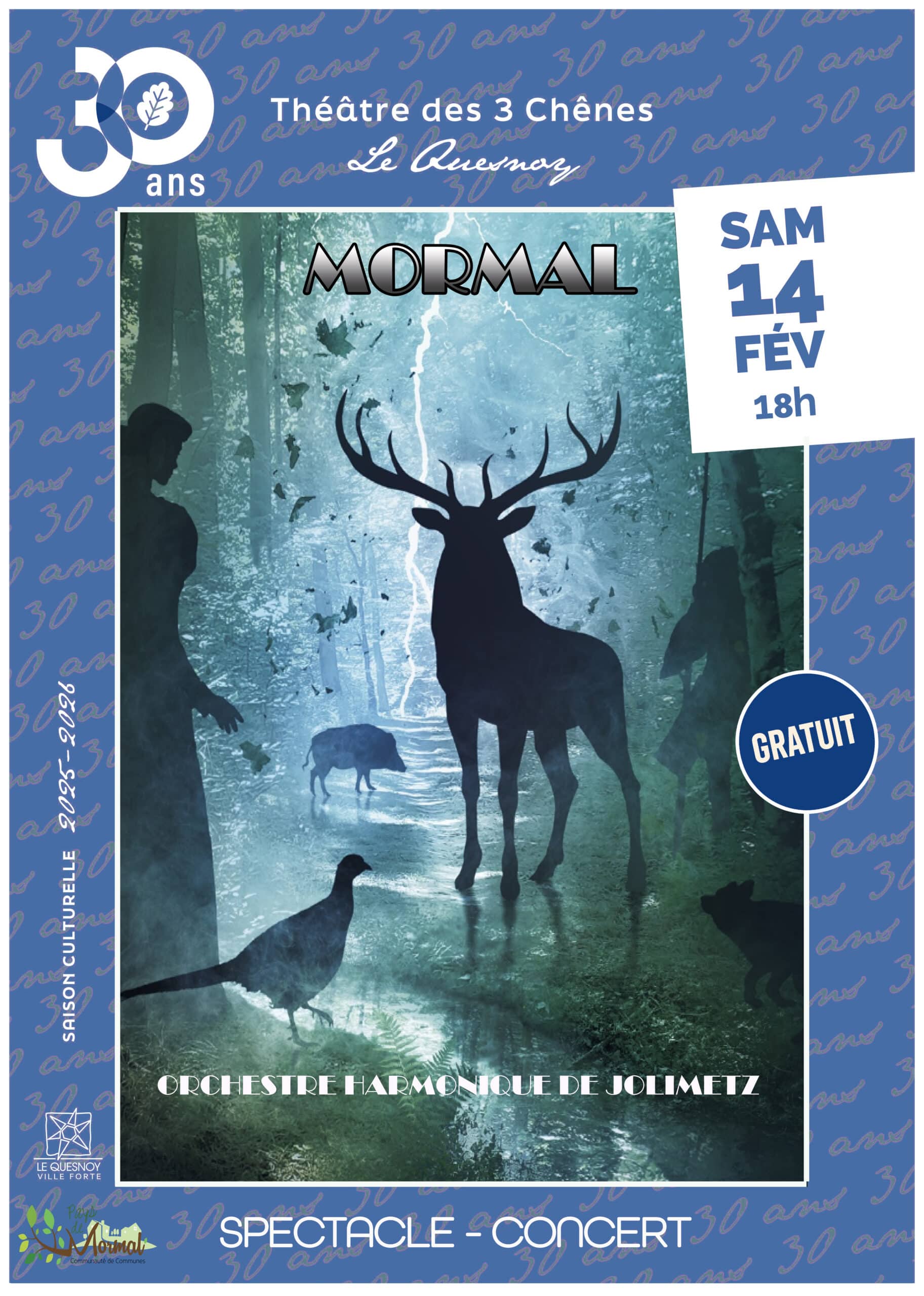 L'ensemble vous invite à un voyage musical inédit au cœur de la forêt de Mormal. Dans la lignée de ses projets originaux, l’orchestre présente une création signée Thibaut Bruniaux, compositeur reconnu et professeur au CRR de Lille. Cette œuvre spécialement écrite pour orchestre d’harmonie se déploie en dix tableaux musicaux, inspirés des contes et légendes de la mystérieuse forêt de Mormal : épopées chevaleresques, tempêtes, paysages enchanteurs et sources mythiques... Le tout sublimé par des projections visuelles mêlant images oniriques et reconstitutions immersives. Ce concert-spectacle unique, entre musique, imaginaire et nature, sous la direction de Gaëtan Vienne est proposé par la CCPM.