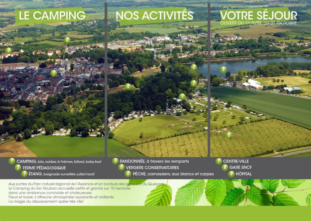 Le camping est situé dans l’Avesnois réputé pour ses grands espaces verts. Le cadre est verdoyant, la faune et la flore prolifèrent dans cet espace bordé de forêt et d’eau. Comme son nom l’indique, le camping du Lac Vauban est au cœur de la cité fortifiée du Quesnoy construite par Vauban au XVIIème siècle à la demande de Louis XIV. Site historique et classé, les amoureux d’histoire et d’architecture pourront contempler les remparts – les fortifications étant situées à quelques mètres du camping.